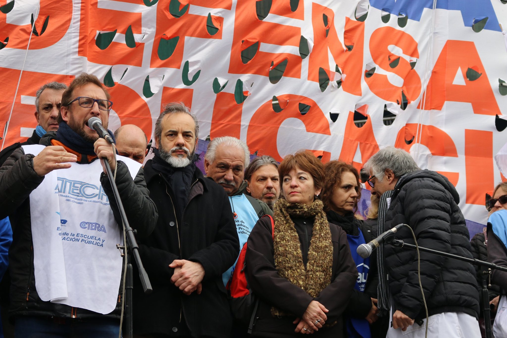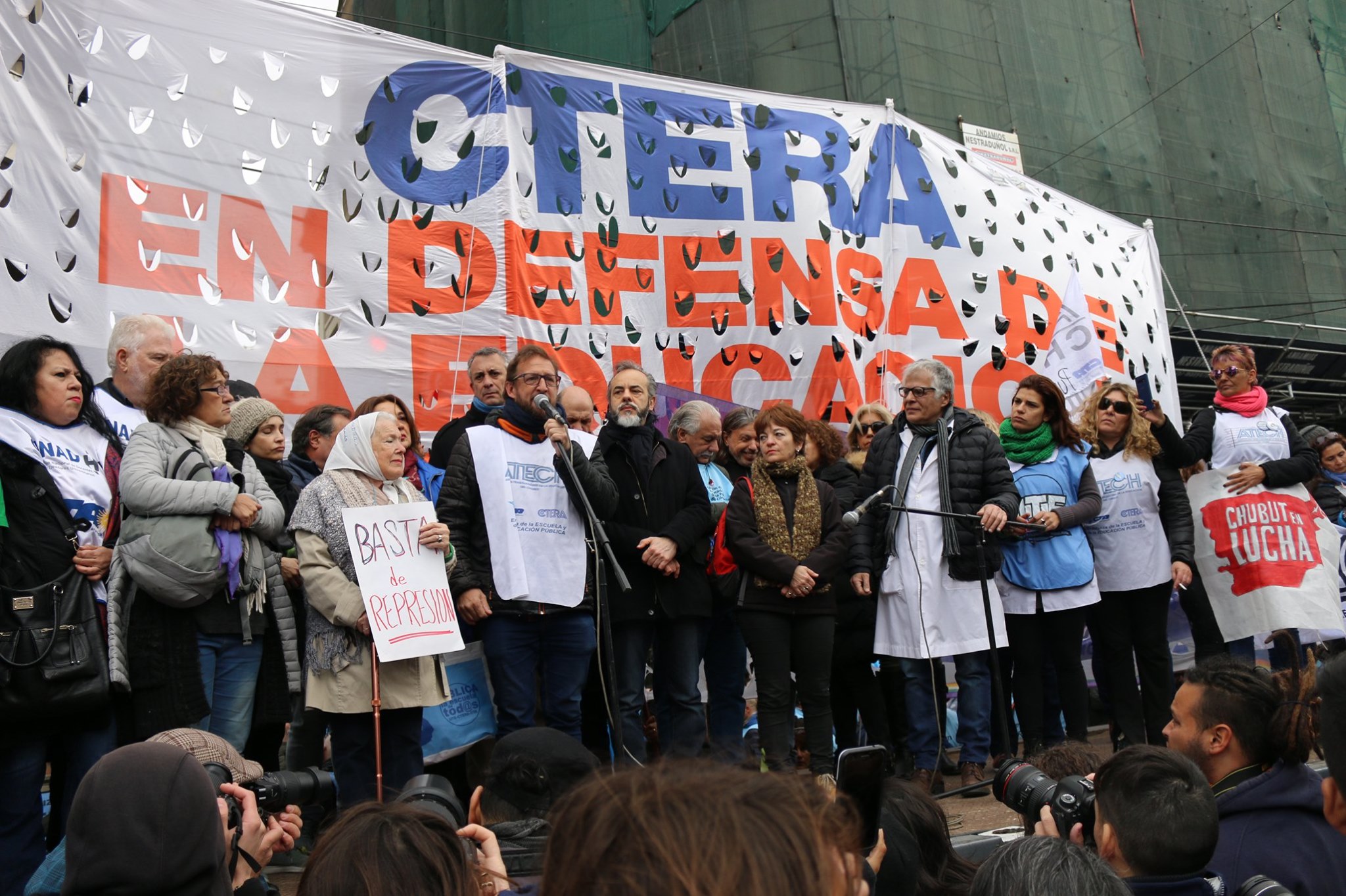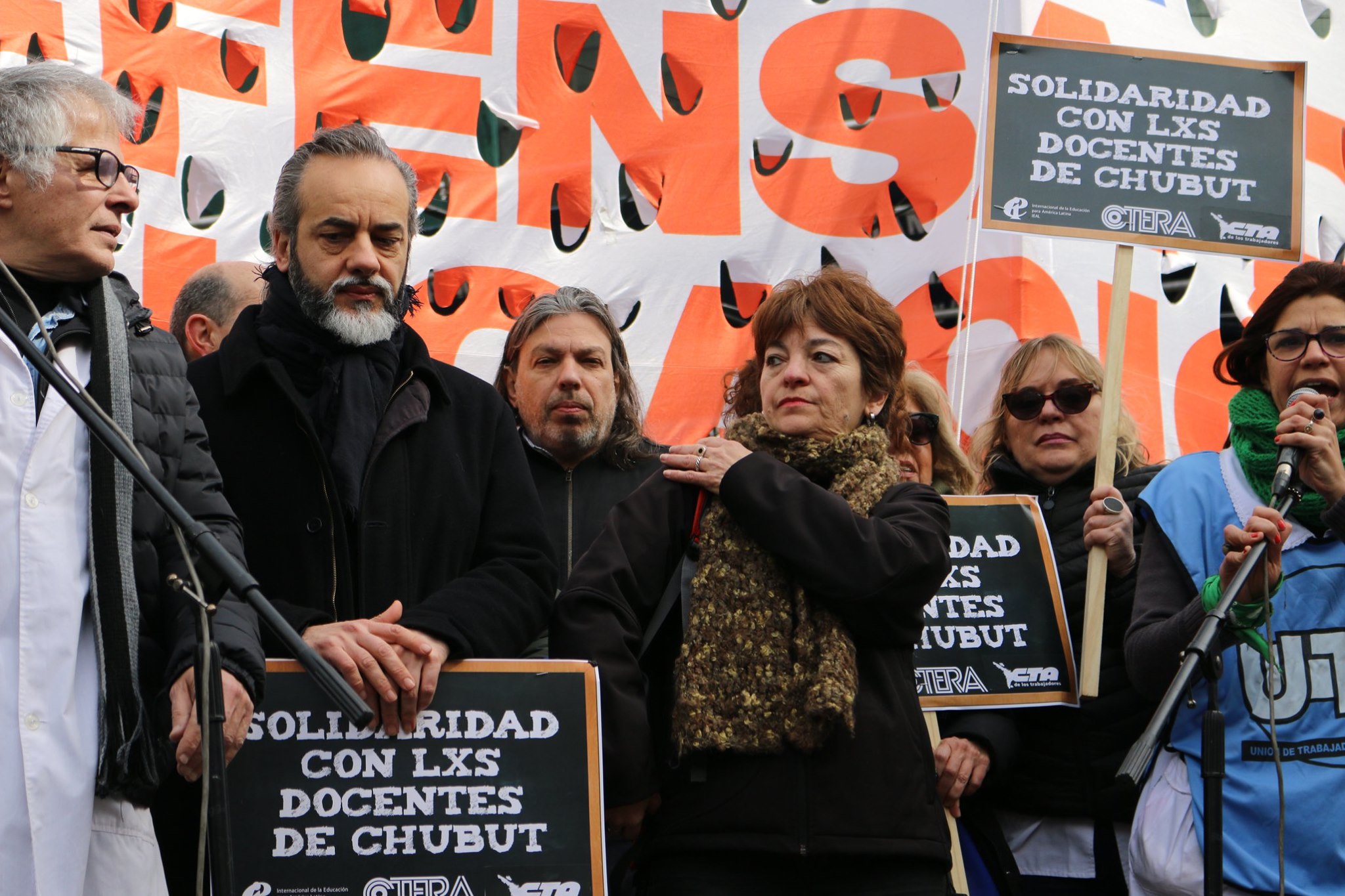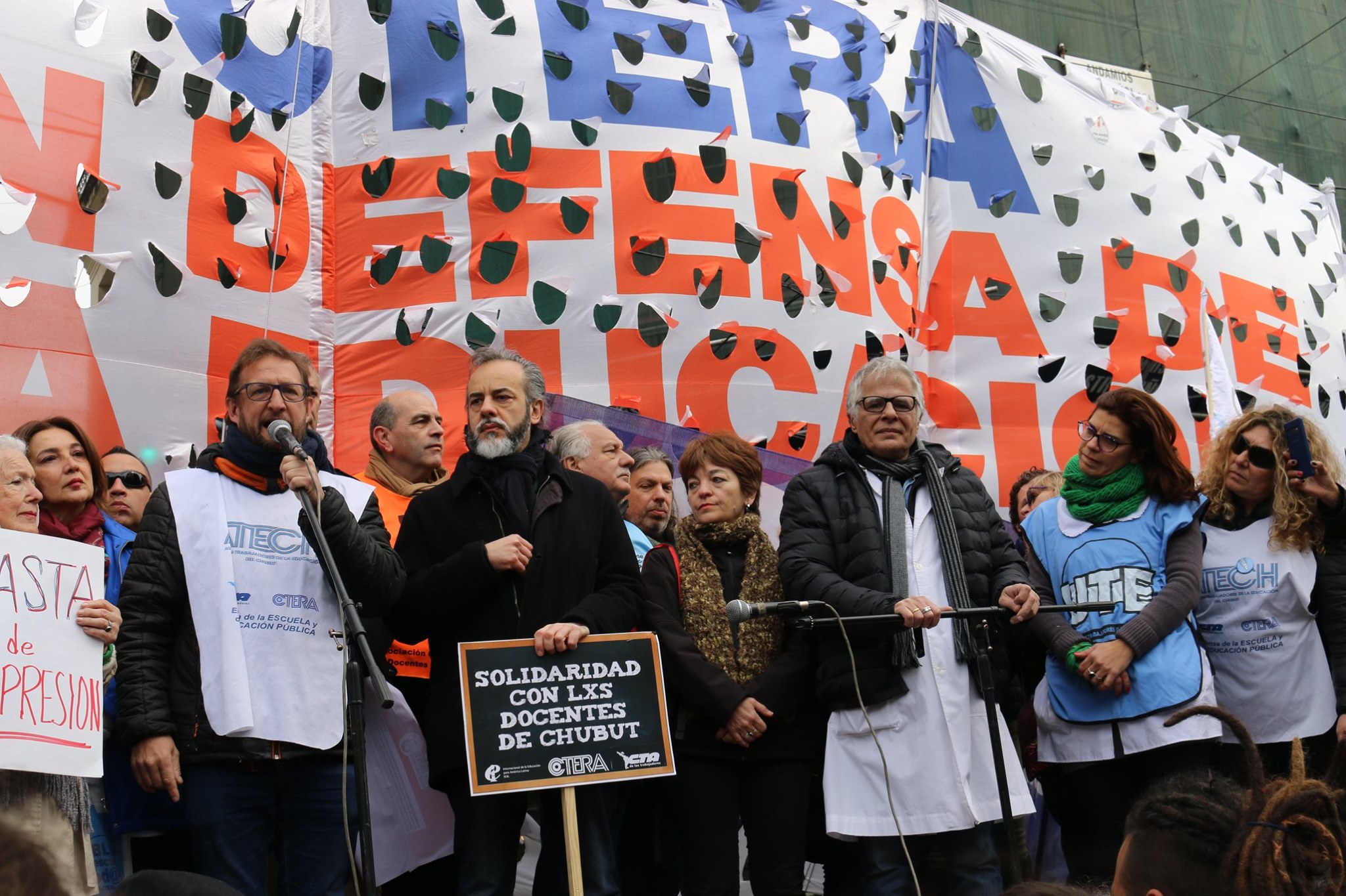 La jornada de protesta de hoy se realizó en solidaridad con todos los compañeros y compañeras chubutenses que en el día de ayer fueron agredidos por una patota vinculada al sector petrolero mientras se encontraban luchando en defensa de los derechos incumplidos por parte del Estado provincial. Como consecuencia del ataque, hubo cinco docentes con heridas de considerable gravedad.